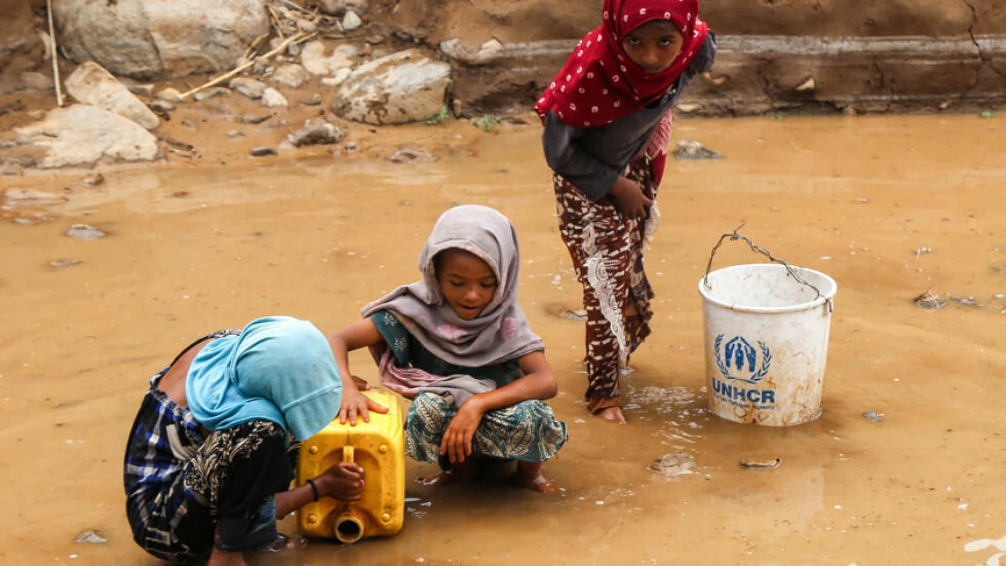 Yemeni children fill a jerrycan with water after flash floods in Hodeida province on the Red Sea coast. © Khaled ZIAD / AFP