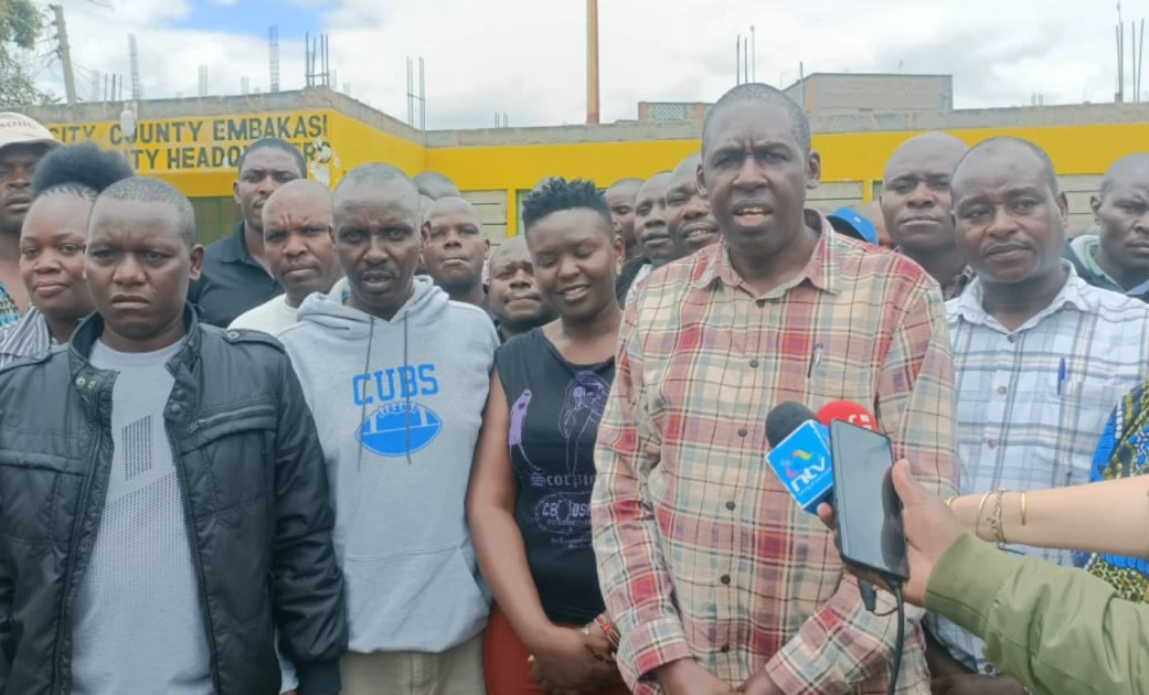 Kenya Aviation Workers Union (KAWU), led by their Secretary General Moss Ndiema, address the press.