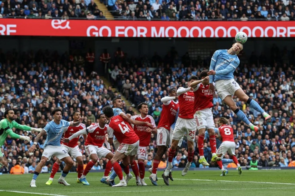 Manchester City's Norwegian striker #09 Erling Haaland (R) heads the ball in front of goal during the English Premier League football match between Manchester City and Arsenal at the Etihad Stadium in Manchester, north west England, on April 19, 2026. (Photo by Darren Staples / AFP)