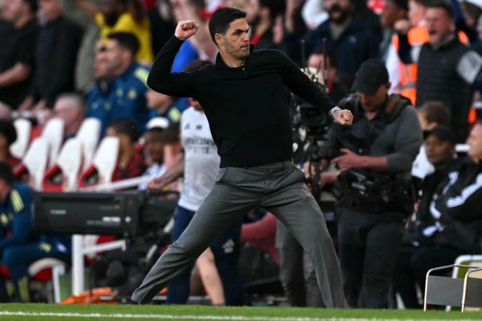 Arsenal's Spanish manager Mikel Arteta celebrates at the final whistle during the English Premier League football match between Arsenal and Newcastle United at the Emirates Stadium in London on April 25, 2026.