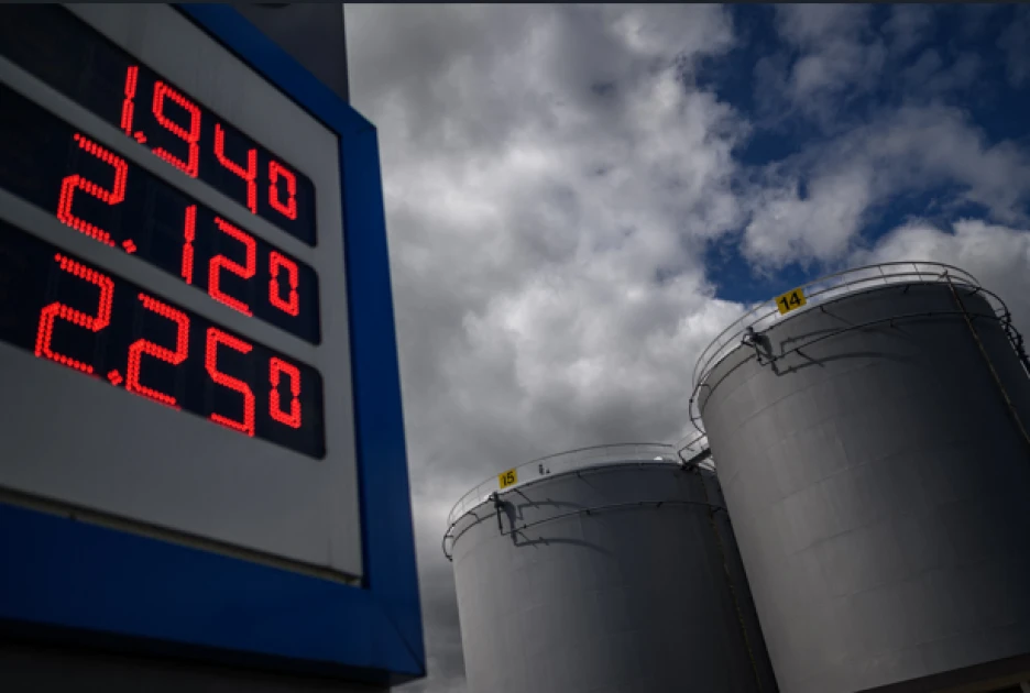 This photograph shows the prices per litre of petrol and diesel fuels at a petrol station next to gasoline and fuel tanks in Geneva on March 31, 2026. Photo by FABRICE COFFRINI / AFP