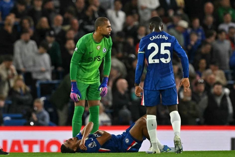 Chelsea's French defender Wesley Fofana reacts after picking up an injury during the English Premier League football match between Chelsea and Manchester United at Stamford Bridge in London on April 18, 2026. (Photo by Glyn KIRK / AFP)