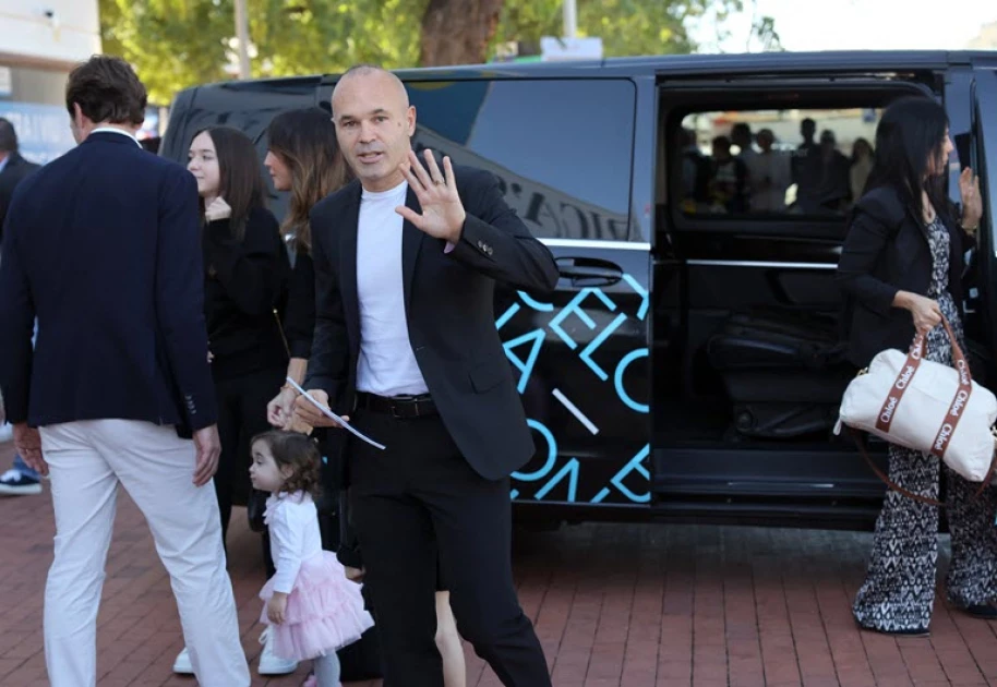 Spanish footballer Andres Iniesta waves as he arrives with his family at an event to celebrate his career at the America's Cup Experience venue in Barcelona on October 8, 2024. Andres Iniesta scored the most important goal in the history of Spanish football, winning his country the World Cup for the first time in 2010. Iniesta came through Barcelona's La Masia youth academy, joining the club aged 12, departing 22 years later to join Japanese club Vissel Kobe before spending last season at Emirates in the United Arab Emirates. (Photo by LLUIS GENE / AFP)