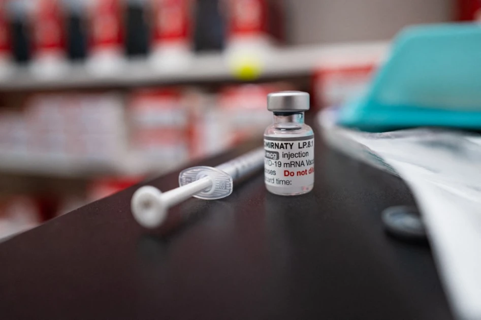 Syringe and vaccine vial placed on the edge of a table in a pharmacy room reserved for vaccinating patients who can be vaccinated without an appointment in Saint Ouen sur Seine in the department of Seine Saint Denis in France on January 28, 2026.