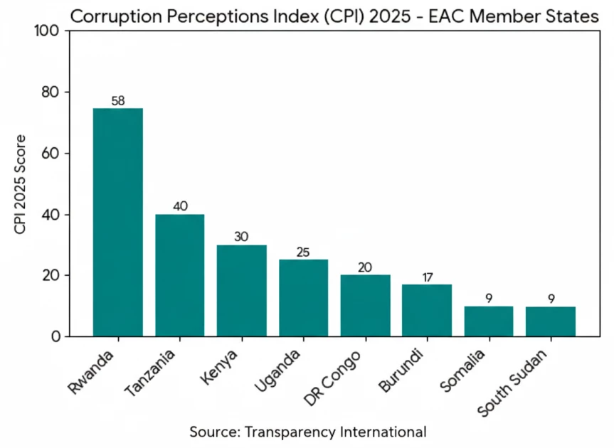 While Kenya struggled with corruption in 2025, Uganda and DR Congo recorded high corruption. Very high corruption was observed in Burundi, as in Somalia and South Sudan, which were found to be in a critical state.