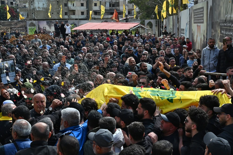 Mourners carry the flag-draped casket of a member of the Iran-backed militant group Hezbollah who was killed in southern Lebanon during their funeral in the Kafaat area in Beirut's southern suburbs on April 20, 2026. Hezbollah lawmaker Hassan Fadlallah said on April 20 that his group would work to break the "Yellow Line" that Israel established in southern Lebanon, adding that no one could disarm the Iran-backed group. Lebanon was drawn into the Middle East war on March 2 when Tehran-backed militant group Hezbollah launched attacks on Israel to avenge the killing of the Iranian leader. Israel has responded with broad strikes across Lebanon and a ground offensive.