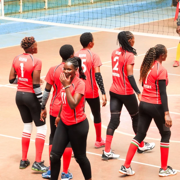 Kenya Prisons players celebrate a point against Kenyatta University during Kenya Volleyball Federation National Women's League at Nyayo Gymnasium on Thursday, April 16 2026