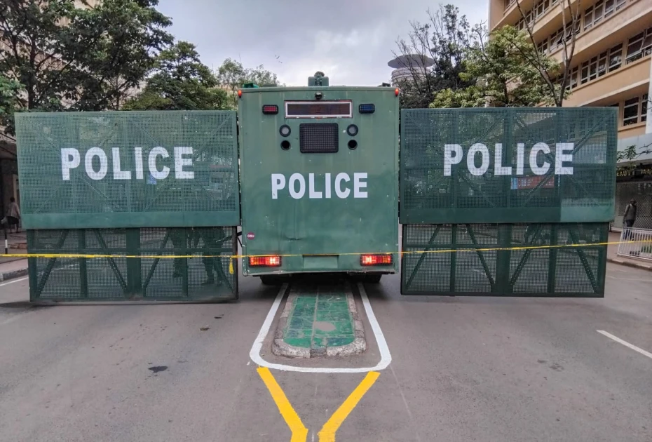 A police barrier blocks road in Nairobi CBD.