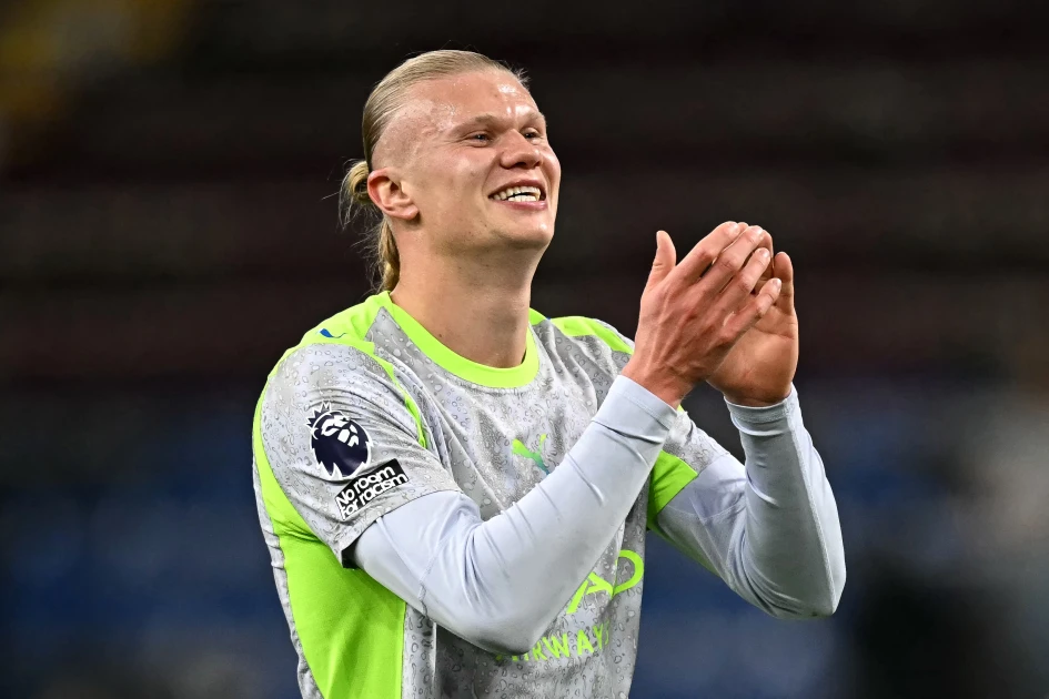 Manchester City's Norwegian striker #09 Erling Haaland applauds the fans following the English Premier League football match between Burnley and Manchester City at Turf Moor in Burnley, north-west England on April 22, 2026. (Photo by Paul ELLIS / AFP)