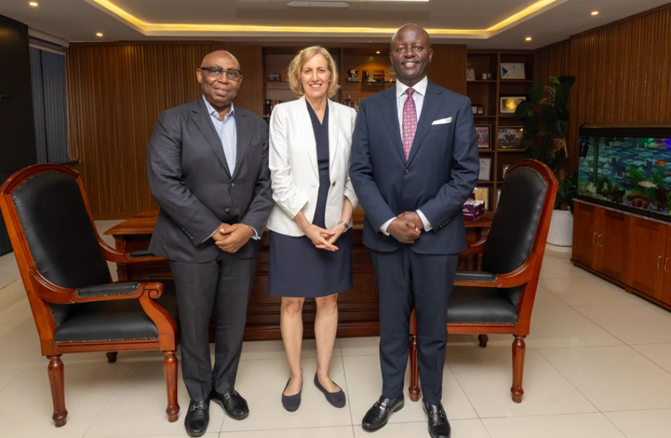 Kuramo Capital CEO Wale Adeosun and Co-CEO Shaka Kariuki pose for a photo with US Embassy Chargé d'Affaires, Susan Burns at Kuramo Offices in Nairobi following a courtesy call.