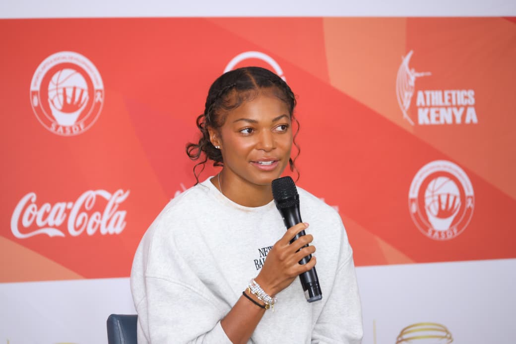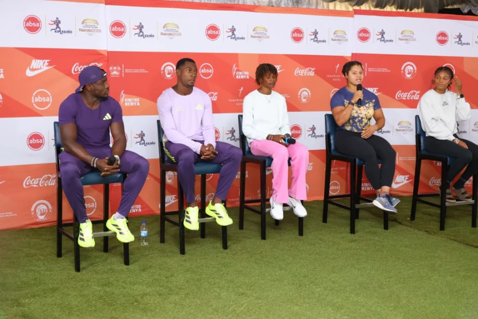 Ferdinard Omanyala (left) and other Kip Keino Classic-bound athletes field questions from journalists in Nairobi on April 23, 2026.
