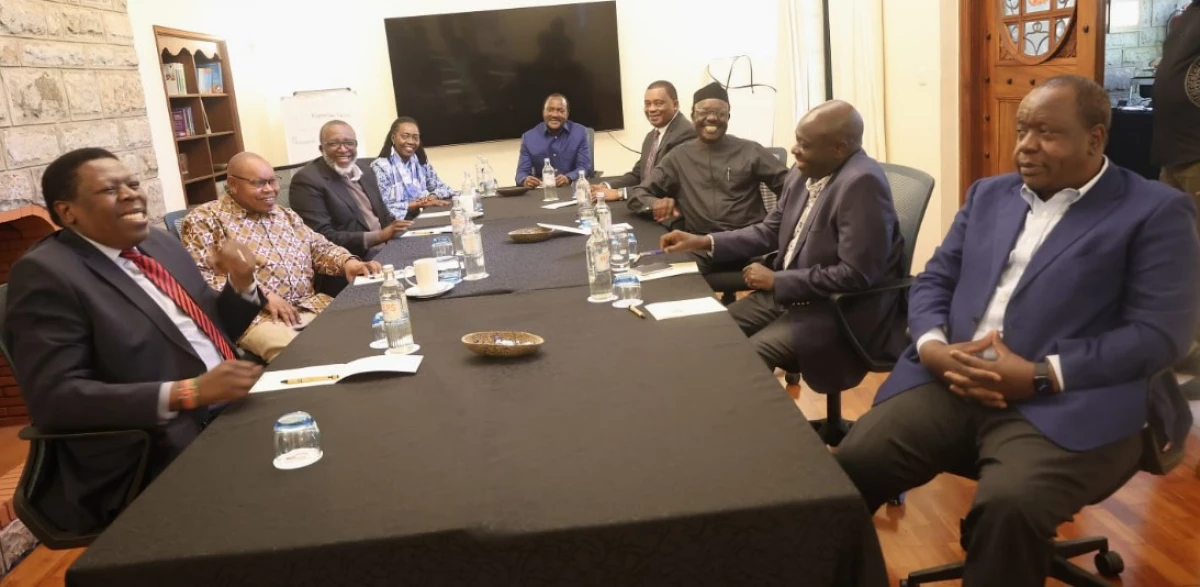 Opposition figures comprising People's Liberation Party (PLP) leader Martha Karua, Wiper's Kalonzo Musyoka, former Deputy President Rigathi Gachagua, former Agriculture CS Mithika Linturi, former Public Service CS Justin Muturi, DAP K party leader Eugene Wamalwa and former PS Torome Saitoti and former Interior CS Fred Matiang'i hold a meeting on April 29, 2025.
