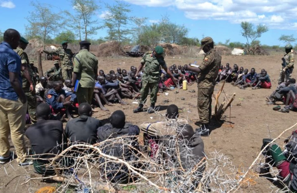 File image of Turkana pastoralists arrested with weapons in Uganda facing a court martial in Karamoja in April 2023. PHOTO | COURTESY
