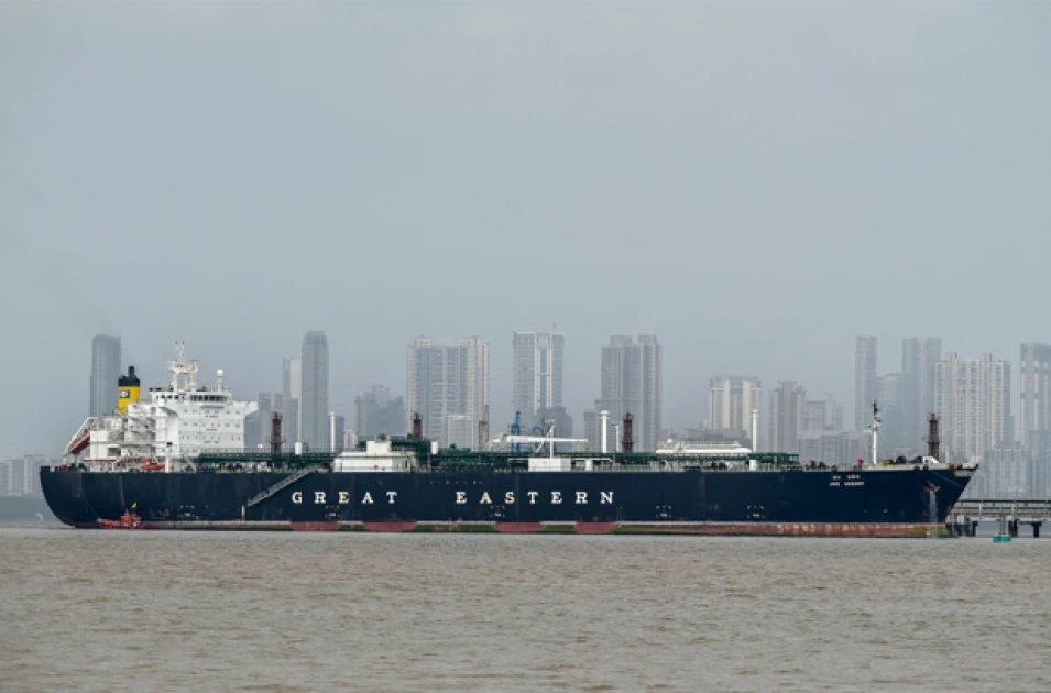 Jag Vasant, an Indian-flagged tanker carrying liquefied petroleum gas (LPG) that transited through the Strait of Hormuz amid the Middle East war, remains docked at an offloading terminal along the coast in Mumbai on April 1, 2026. Photo by Punit PARANJPE / AFP