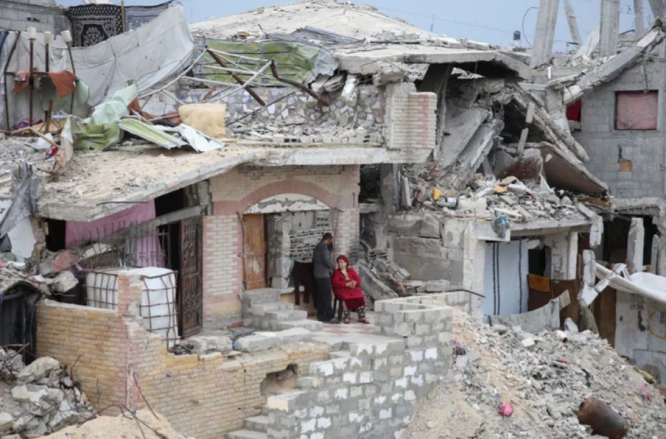 Palestinians gather outside a building destroyed during the Israeli offensive, amid a ceasefire between Israel and Hamas, in Khan Younis in the southern Gaza Strip February 5, 2025. REUTERS/Hatem Khaled