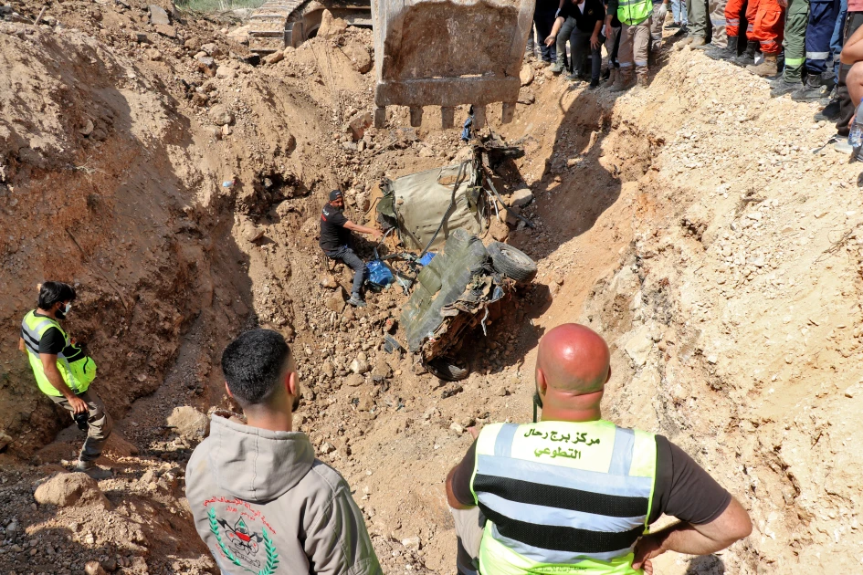 Lebanese Civil Defense personnel unearth a destroyed car next to the bomb-damaged Qasmiyeh bridge near the southern city of Tyre on April 20, 2026. Lebanon was drawn into the Middle East war on March 2 when Tehran-backed militant group Hezbollah launched attacks on Israel to avenge the killing of the Iranian leader. Israel has responded with broad strikes across Lebanon and a ground offensive.