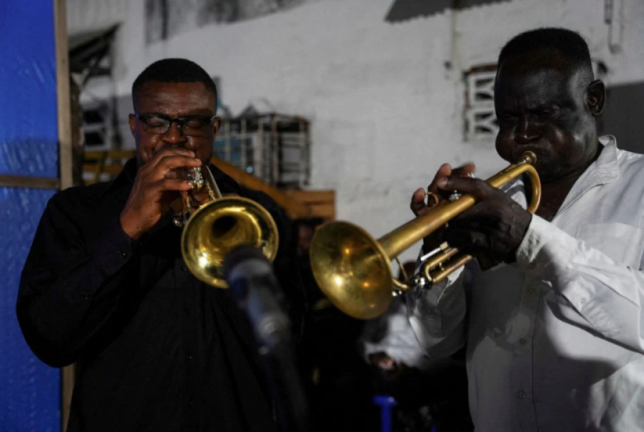 Trumpeters from the Bana OK band play at La Septante club in the Kasa-Vubu quarter of Kinshasa, Democratic Republic of Congo September 24, 2021. REUTERS/Hereward Holland