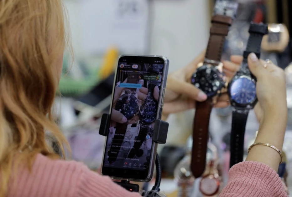 A shopkeeper sells watches live on a social media platform at the International Trade Center (ITC) mall in Jakarta, Indonesia, September 27, 2023. REUTERS/Willy Kurniawan