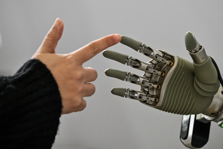 A woman touches a robotic hand from OY Motion during the Global Developer Conference, organised by the Shanghai AI Industry Association, in Shanghai on February 21, 2025.