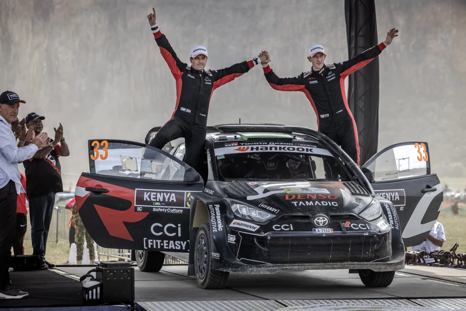 oyota Gazoo Racing WRT's British driver Elfyn Evans (C-R) and co-driver Scott Martin (C-L) celebrate after winning the World Rally Championship (WRC) Safari Rally Kenya in Naivasha on March 23, 2025. (Photo by Luis TATO / AFP)