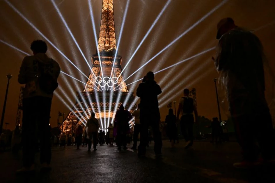 Attendees take pictures of the Eiffel Tower as lasers light up the sky during the opening ceremony of the Paris 2024 Olympic Games in Paris on July 26, 2024. (Photo by Martin BERNETTI / AFP)