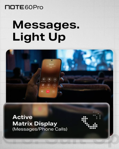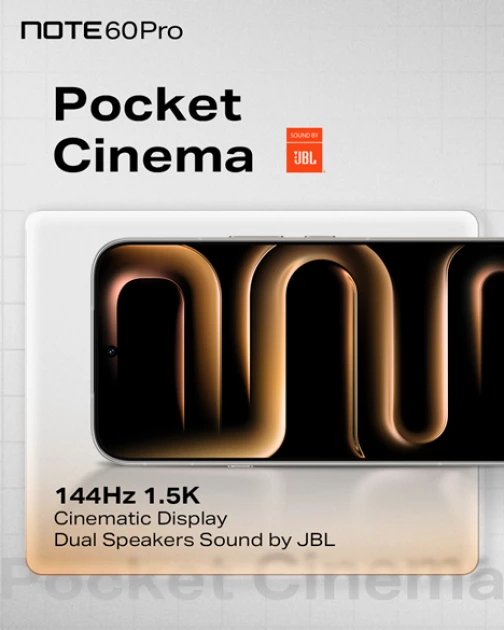 It further elevates everyday experiences with an avant-garde Active-Matrix Display hat stays invisible when inactive, yet transforms into a dynamic interface for personalized interactivity, intelligent notifications, and on-screen entertainment-expanding what a smartphone can do in everyday life. Paired with a fluid 144Hz 1.5K Ultra HDR Cinematic Display and immersive audio tuned by SOUND BY JBL, the NOTE 60 Pro sets a new benchmark for premium multimedia experiences within its segment, proving that exceptional technology can be both powerful and pleasurable.