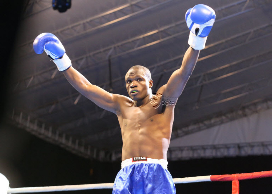 Rayton Okwiri celebrates victory against Patrick Amote of Uganda during their 8-round middleweight contest at KICC in Nairobi Kenya on September 08, 2018. Okwiri won the bout on a TKO. PHOTO/Sila Kiplagat/Sportpicha