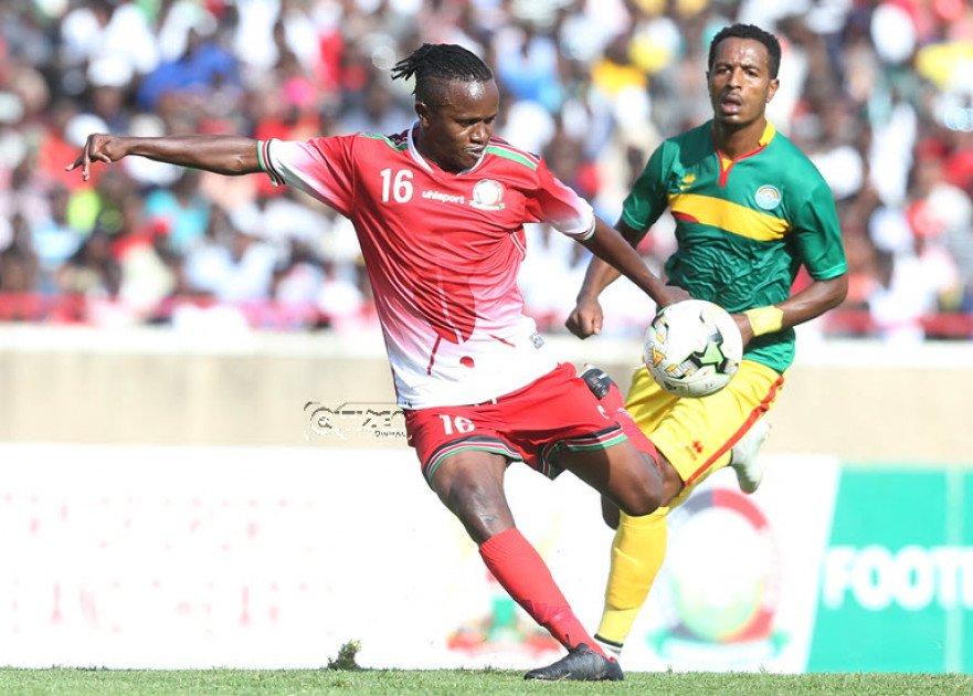 Harambee Stars attacking midfielder Francis Kahata shoots past Aschalew Tamene of Ethiopia during their AFCON 2019 qualifier return leg match at Kasarani stadium in Nairobi, Kenya on October 14, 2018. Kenya won 3-0. PHOTO/Stafford Ondego/Sportpicha