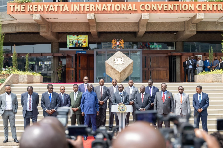 President William Ruto, Raila Odinga and other leaders addressing the press at KICC shortly after President Ruto assented to the Independent Electoral and Boundaries Commission (IEBC) Bill. Photo I @WilliamsRuto/X